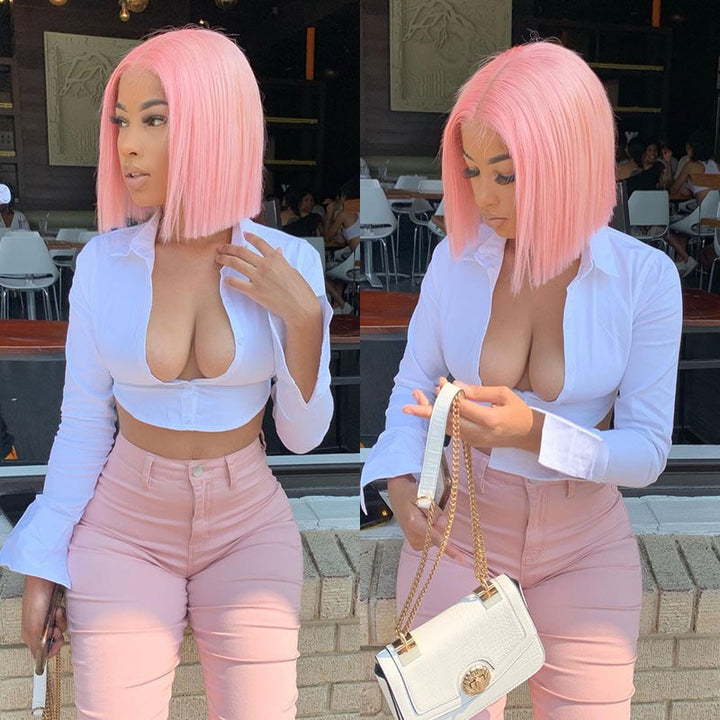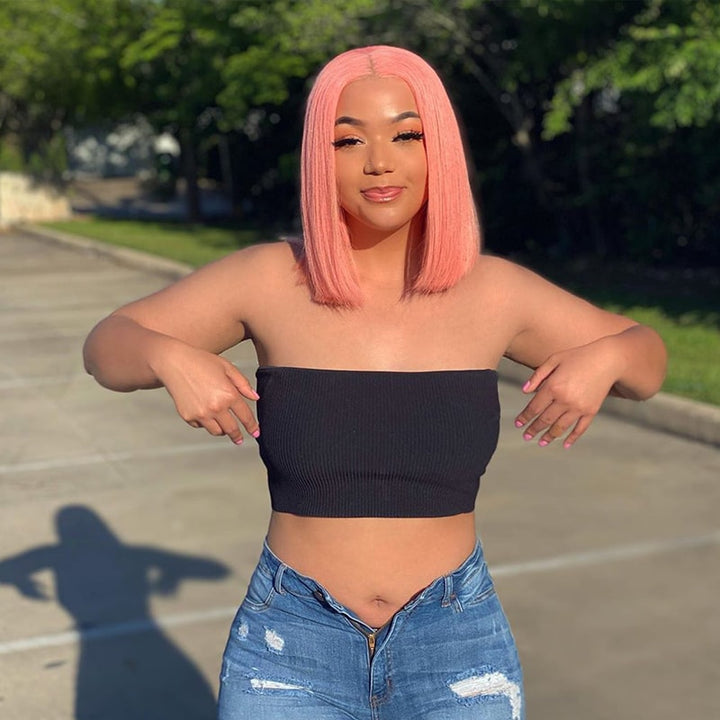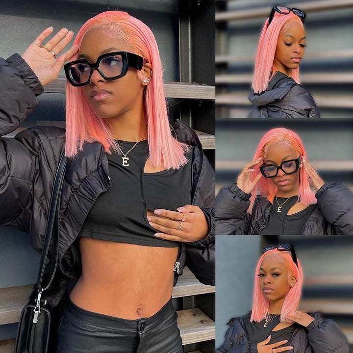 AMBIBI Salmon Pink Color Bob Straight Hair Lace Wigs